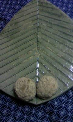 ◎お気に入りの葉っぱのお皿に、きなこのおはぎ乗せたらなんか卑猥でした。